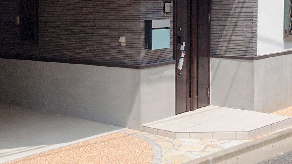 モルタル塗りにアクセントでタイルを貼った重厚感のある外壁、外構の仕上げには乱形タイルとリンクストーンを使った、施主様のセンスあふれる角地の邸宅。