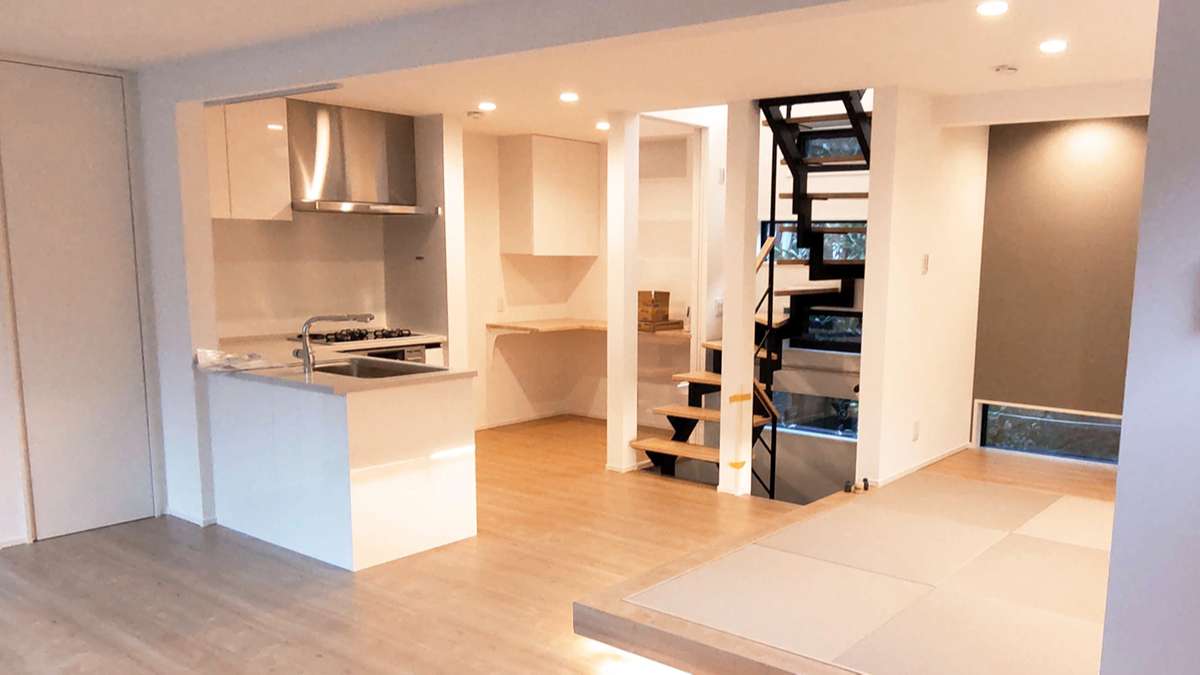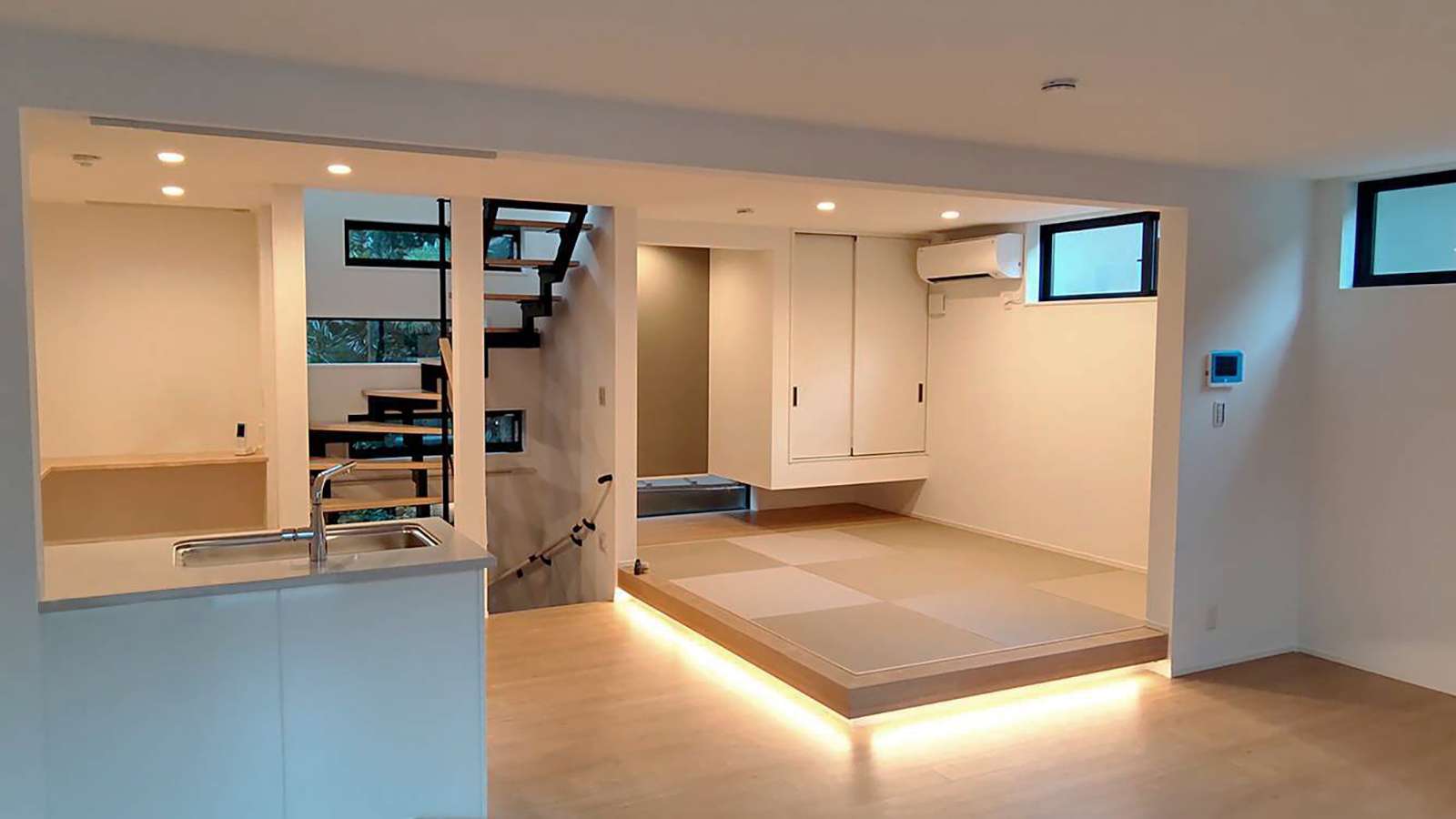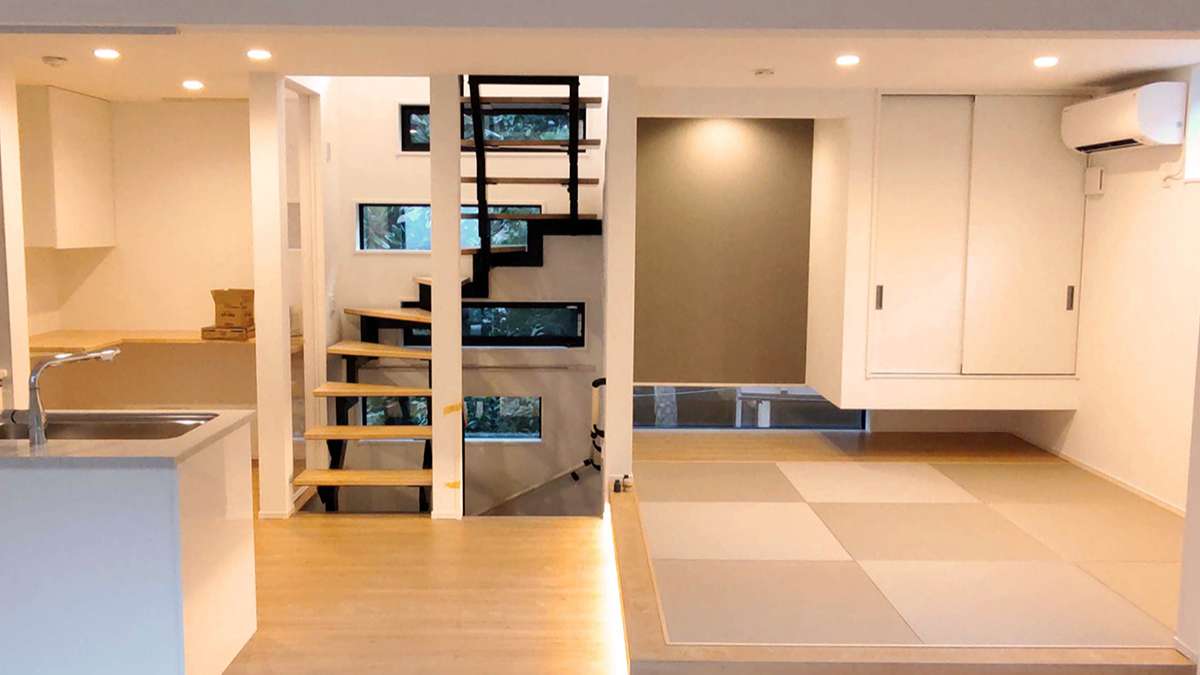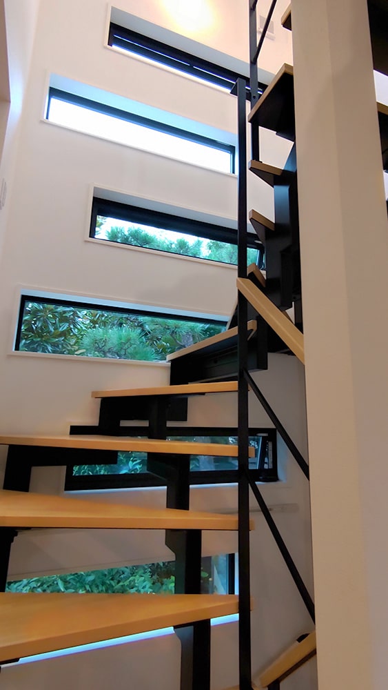 階段には互い違いの小窓があり、プライバシーを守りつつ隣の庭を借景する工夫。間接照明のある畳敷の部屋、吊り収納、床の間などアイディアとこだわりをふんだんに。