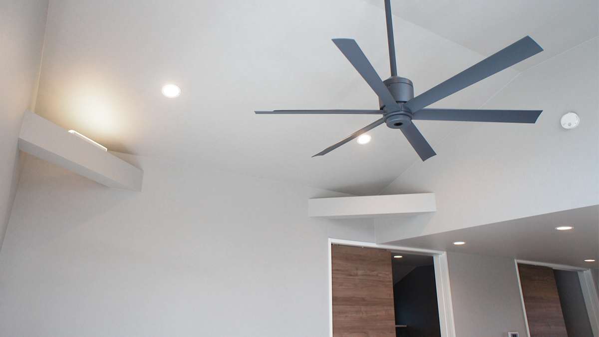 壁紙をグレーで統一。床暖房対応のヨーロピアンオークの挽き板で草木染めのフローリング。コンセントカバーなどの細かなパーツにまで行き届いたこだわり。リビングの階段からはルーフバルコニーに行けます。