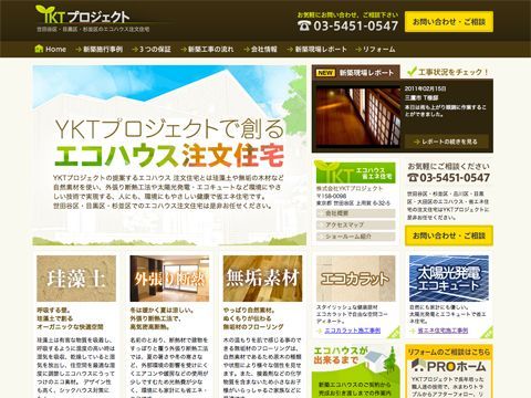 この度、YKTプロジェクトのホームページを制作しました。 珪藻土や無垢材、エコカラットなどエコ素材についてや、外張り断熱、太陽光発電などエコハウスの注文住宅についての情報を豊富に掲載しております。 また、新築工事の進行がチェック出来る新築現場レポートなど随時アップしていきますのでお楽しみに。